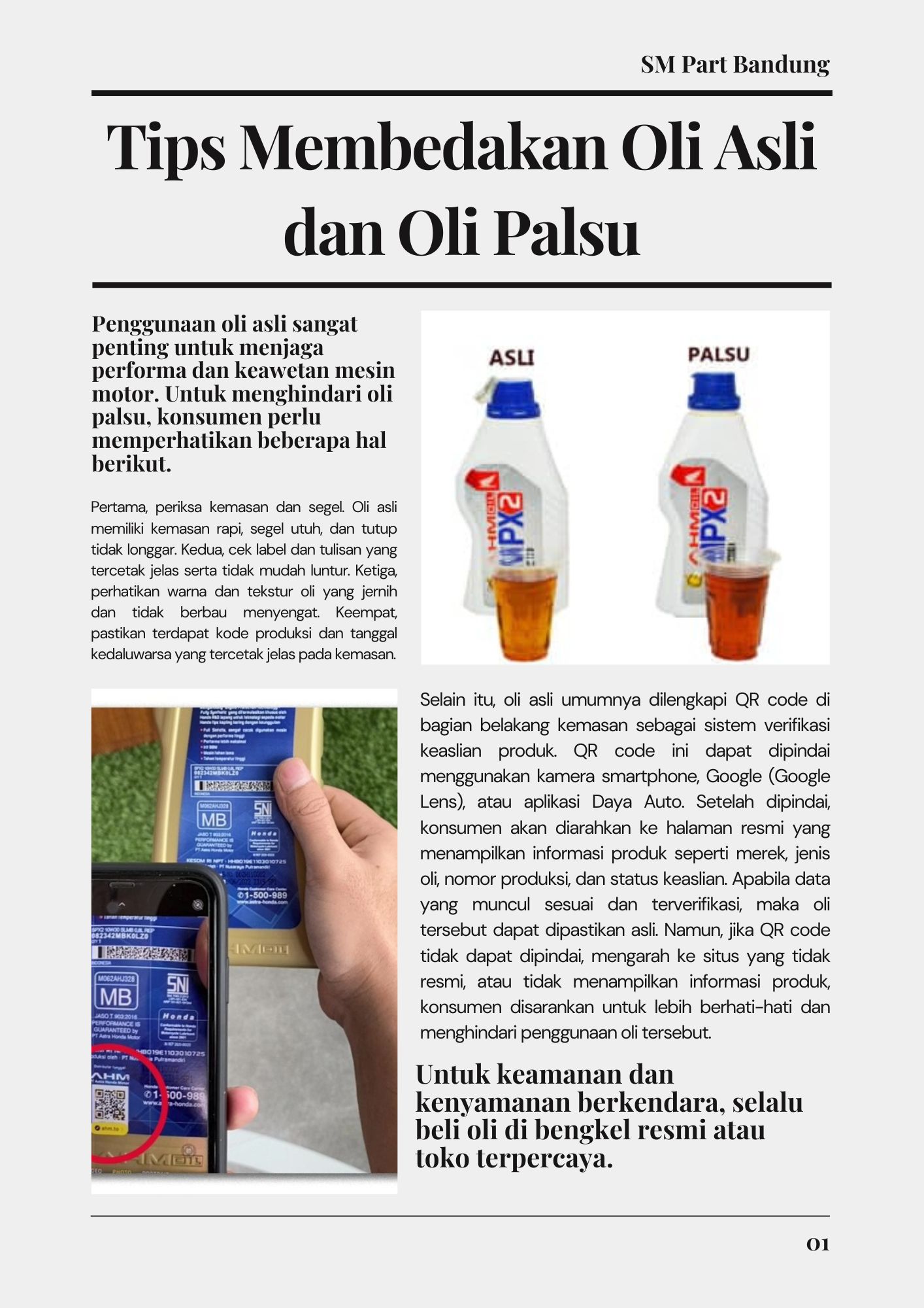 Penggunaan oli mesin yang asli sangat penting untuk menjaga performa, keawetan, dan keamanan mesin sepeda motor. Namun, masih maraknya peredaran oli palsu membuat konsumen perlu lebih waspada sebelum membeli dan menggunakan oli. Oleh karena itu, penting bagi pemilik kendaraan untuk mengetahui tips membedakan oli asli dan oli palsu agar terhindar dari risiko kerusakan mesin dan mendapatkan hasil perawatan yang optimal.